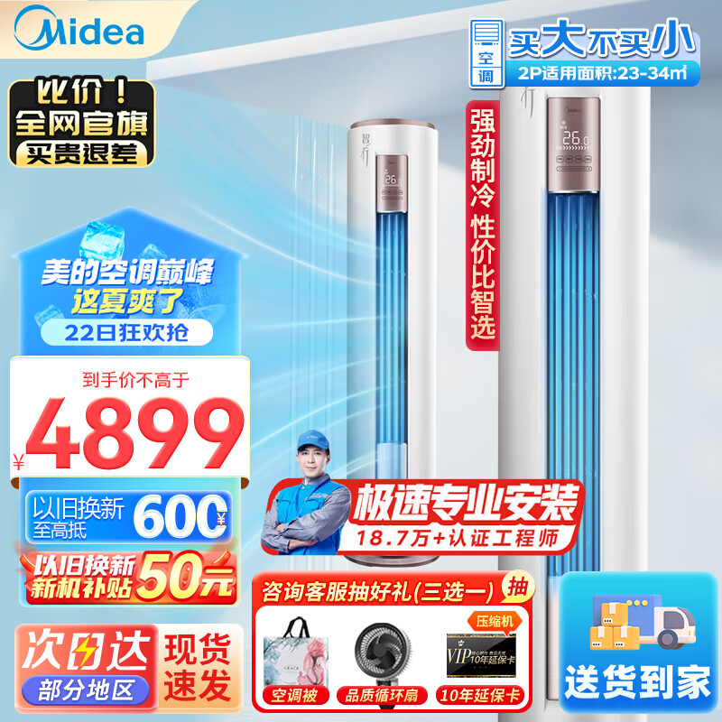 美的(Midea)空调 2匹 智行 新一级能效 变频冷暖 空调立式 客厅空调柜机 KFR-51LW/BDN8Y-YH200(1)A价格:4899.00元!
