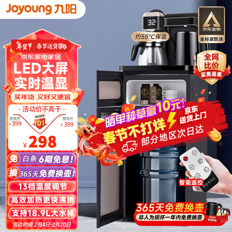 九阳(Joyoung) 茶吧机 家用多功能智遥控大屏显示立式下置式饮水机 双口出水24小时保温 【升级LED大屏显示】 温热型价格:298.00元!