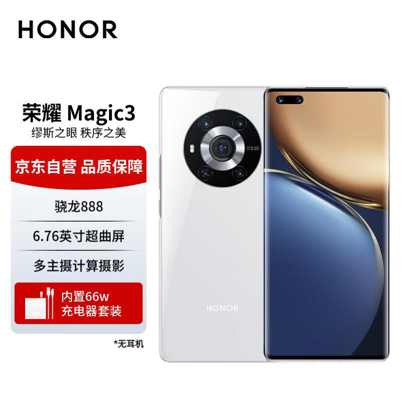 荣耀 Magic3 骁龙888 6.76英寸超曲屏 多主摄计算摄影 66W超级快充 4600mAh大电池 通版 8GB+256GB釉白色价格:1999.00元!