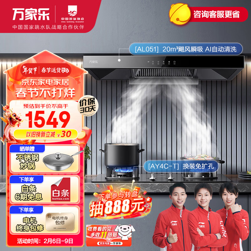 万家乐抽油烟机 欧式烟灶套装 20立方挥手自清洗油烟机5.0kW换新免扩孔燃气灶具套装AT051+AY4C天然气价格:1749.00元!