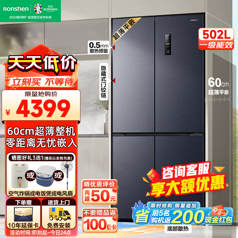 容声(Ronshen)【60cm平嵌】502升大容量十字双开四开门一级变频超薄零距离嵌入式底部散热无霜冰箱BCD-502WD1FPQ价格:5099.00元!