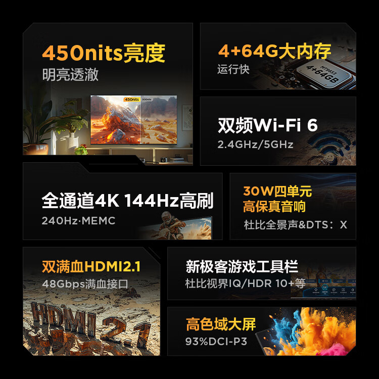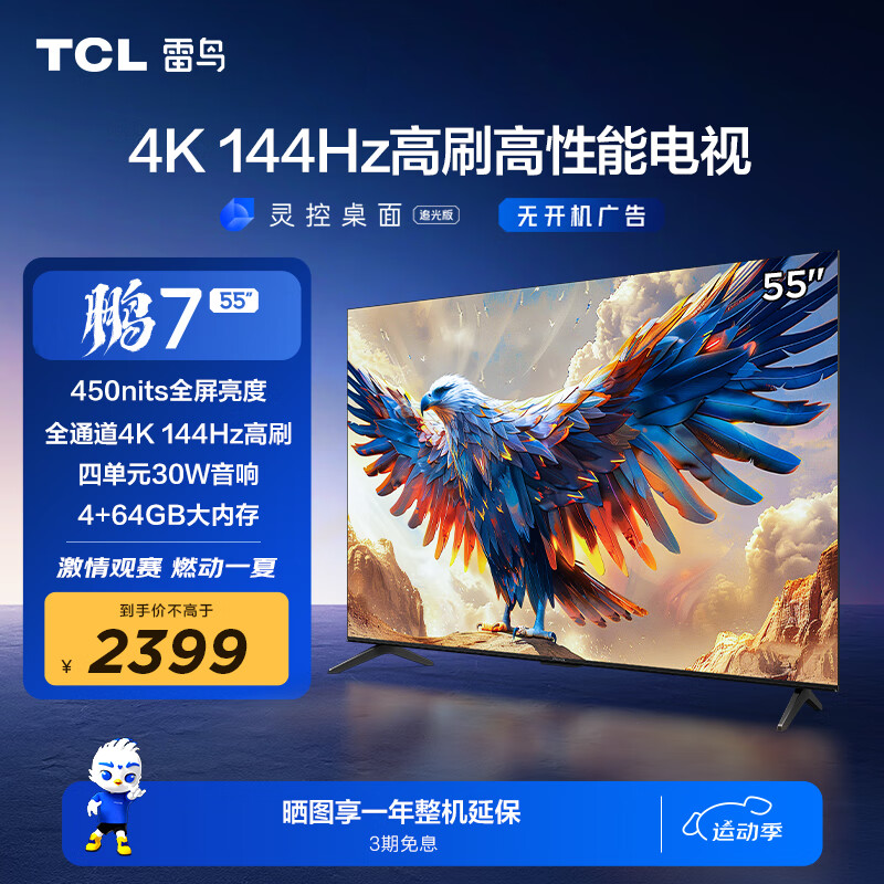TCL雷鸟 鹏7 24款 55英寸游戏电视 144Hz高刷 HDMI2.1 4K超高清 4+64GB 超薄液晶平板电视机55S585C价格:2399.00元!