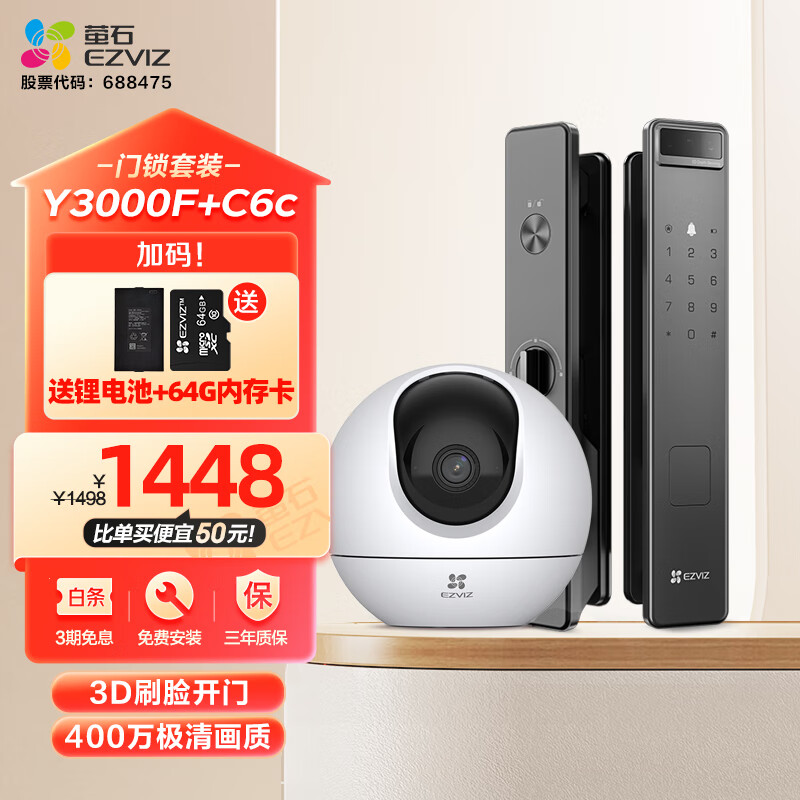 萤石安防套装 Y3000F极光人脸锁+C6c 400万摄像头 3D人脸识别无需指纹全自动智能电子密码门锁套装价格:1448.00元!