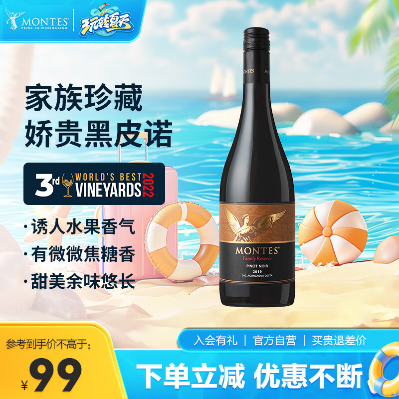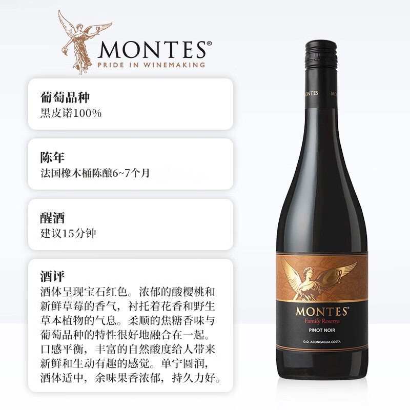 MONTES蒙特斯家族珍藏黑皮诺红酒葡萄酒750ml日常口粮酒智利原瓶进口价格:99.00元!