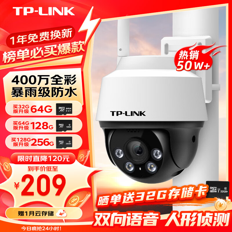 TP-link 400万全彩摄像头家用监控器360无线家庭室外户外tplink可对话网络手机远程门口高清 IPC642-A价格:209.00元!
