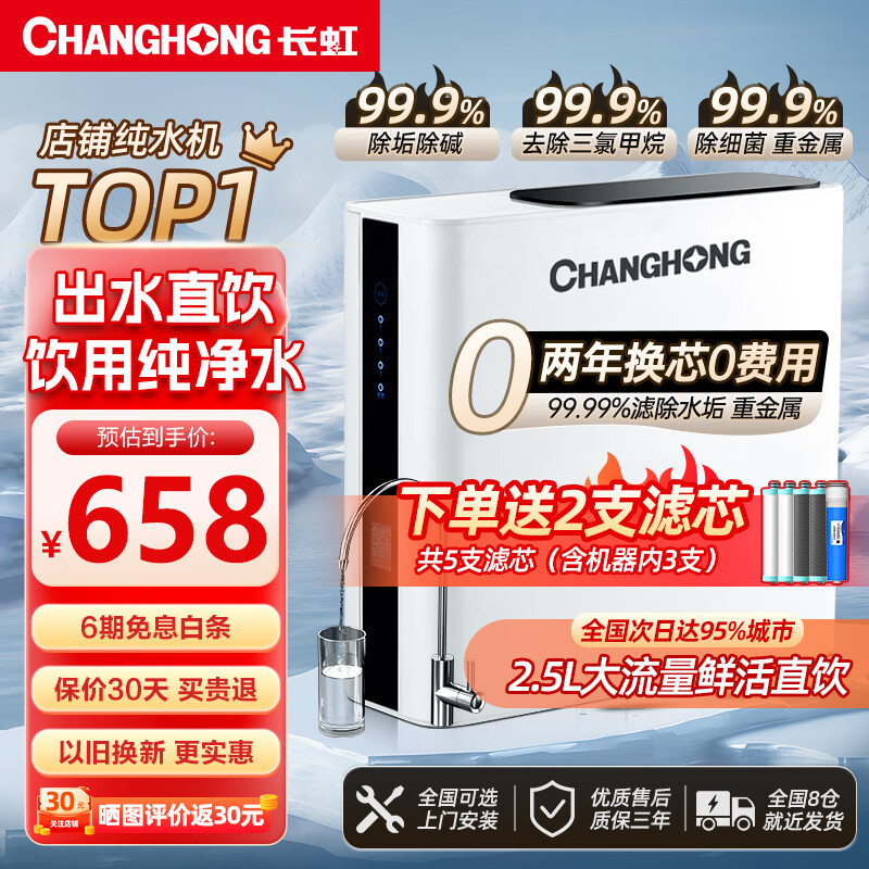 长虹(CHANGHONG)净水器家用直饮自来水纯水机过滤器RO反渗透净水机 除菌除垢除碱 厨下式无陈水省水静音 【除垢直饮】-自行安装价格:999.00元!