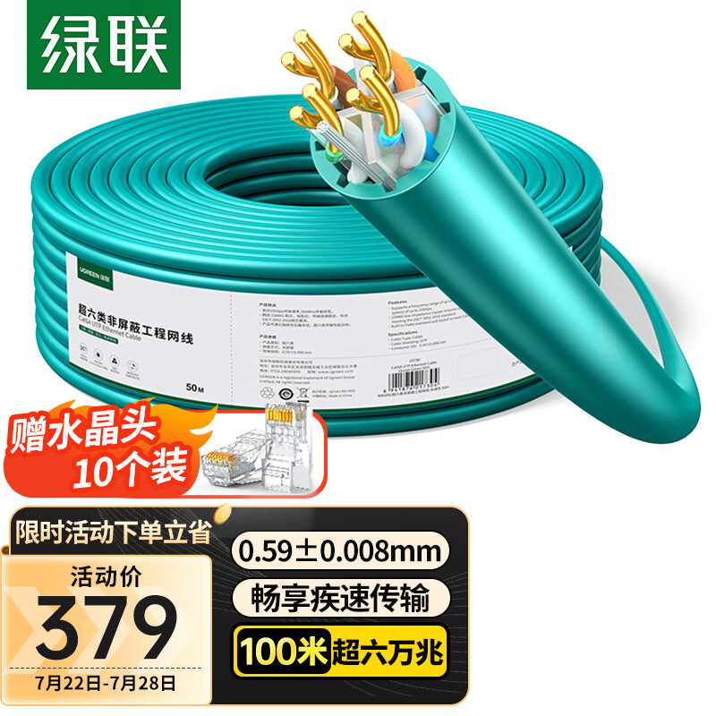 绿联(UGREEN) 超六类非屏蔽网线【0.59±0.008mm纯铜线芯】CAT6A万兆高速 网络POE监控工程家装箱线 100米价格:379.00元!