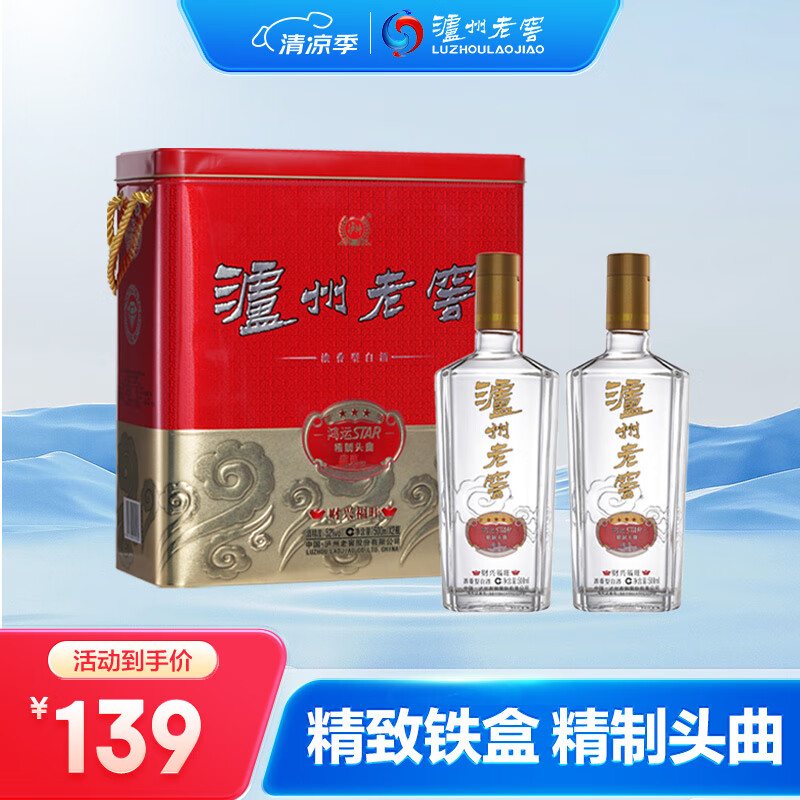 泸州老窖 精制头曲(铁盒)52度浓香型白酒 500ml*2瓶 婚宴喜酒送礼礼盒价格:139.00元!