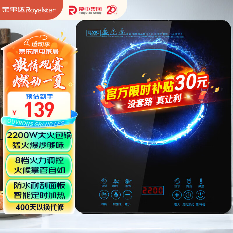 荣事达(Royalstar)电磁炉炒锅家用触控按键一体式2200W大功率一键爆炒耐用面板电磁炉C22-TD01价格:169.00元!