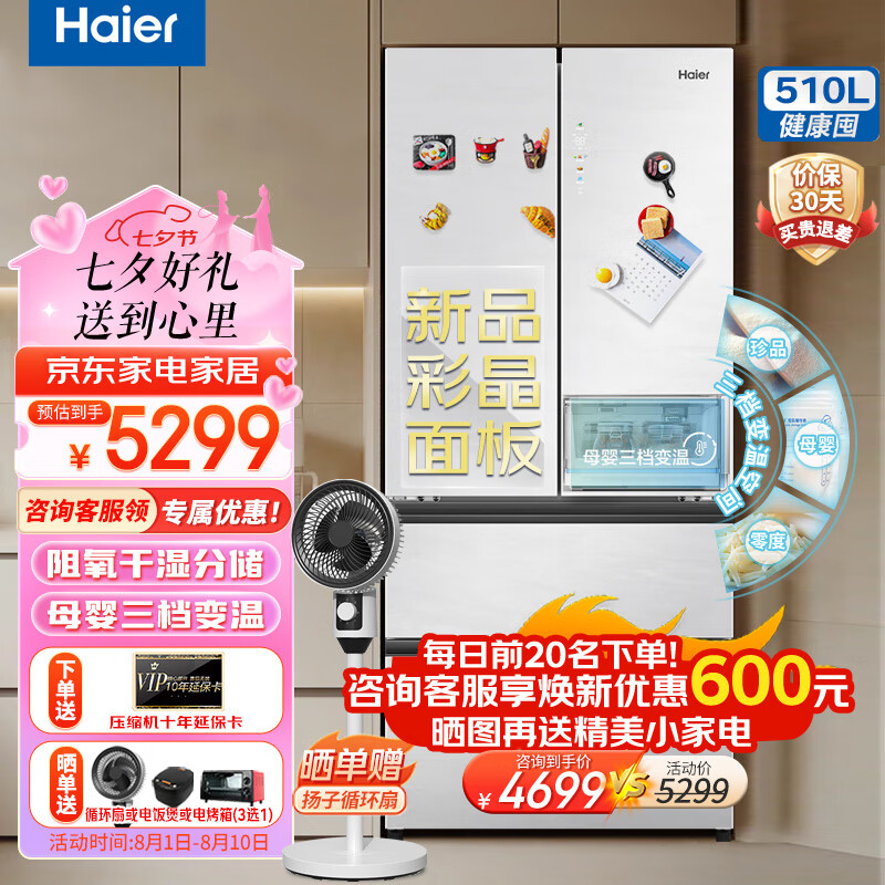 海尔(Haier)510升大容量法式多门四开门家用电冰箱 全新彩晶面板 超薄嵌入式 变频无霜三档变温净味价格:5899.00元!