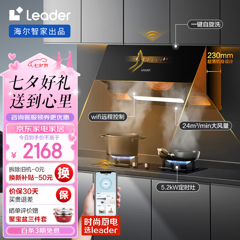 Leader抽油烟机 海尔智家出品 超薄近吸烟灶套装 24m3/min大吸力 油烟机燃气灶套装C2U1+Q2BE7天价格:2168.00元!