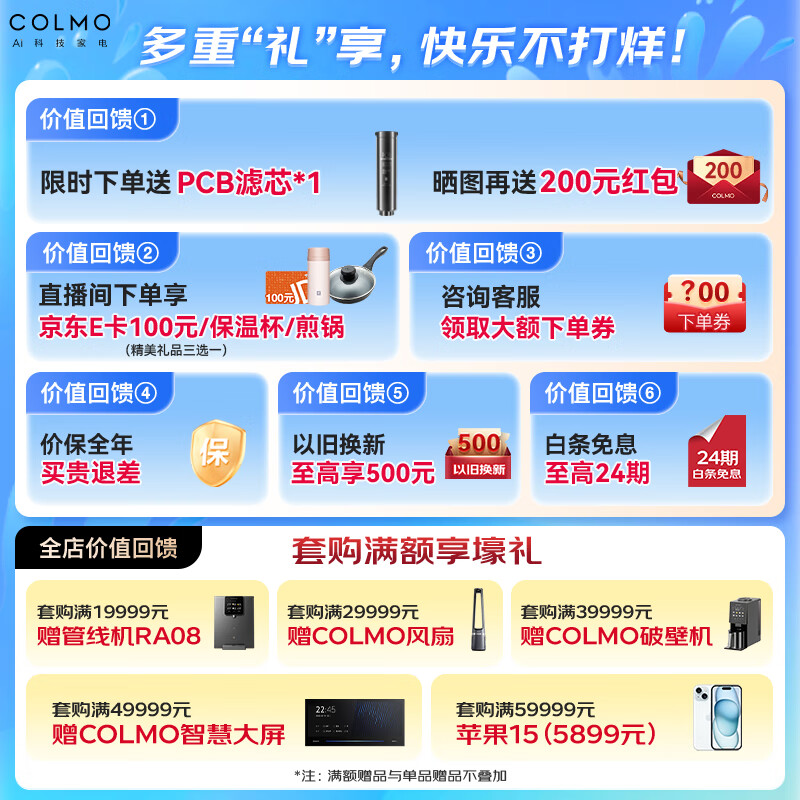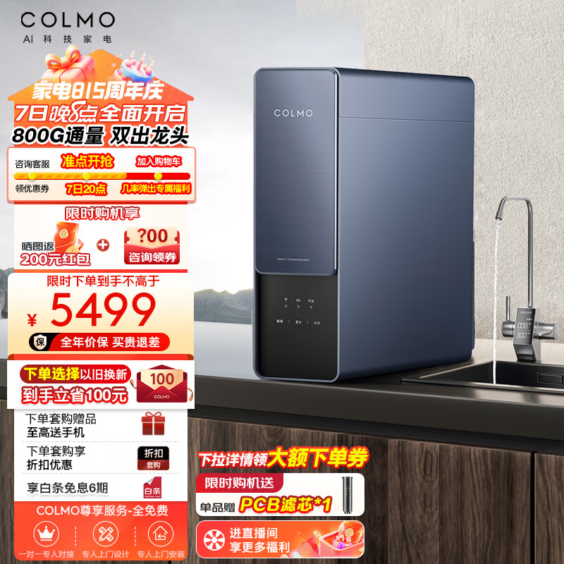 COLMO净水器B38 家用净水机厨房厨下式净饮机直饮机 6年RO反渗透净水机 双出水龙头价格:5499.00元!