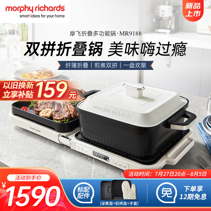 摩飞电器(Morphyrichards)折叠多功能锅 家用聚会嗨吃电火锅电煮锅电炒锅电烧烤炉烤涮一体不沾煎烤料理锅【标配】MR9188白价格:1590.00元!