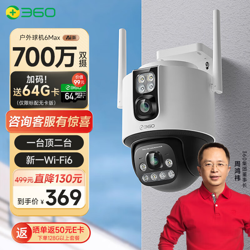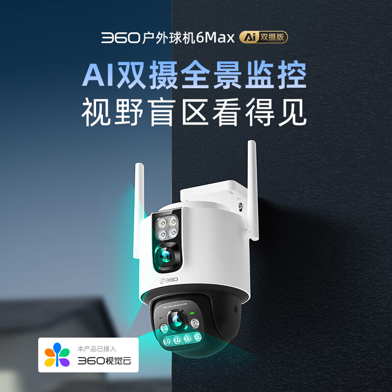 360户外球机6Max 700万超清双摄家用无线监控器手机远程家庭监控360度全景室外摄像头双画面防水夜视价格:369.00元!