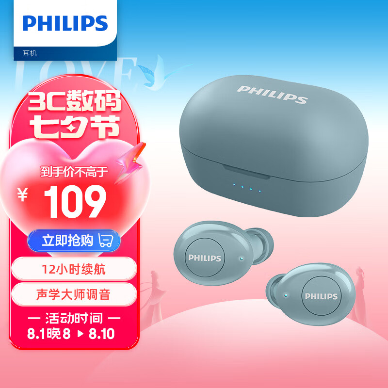 飞利浦(PHILIPS)真无线蓝牙耳机无线耳机音乐游戏耳机双麦回音降噪苹果华为小米安卓手机通用TAUT102S绿价格:108.00元!
