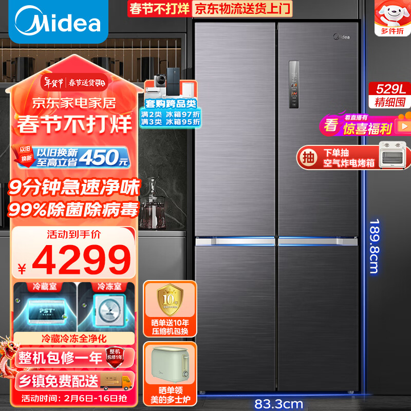 美的(Midea)9分钟急速净味529升一级能效十字对开双开门四开门家用智能电冰箱除菌BCD-529WSPZM(E)超薄大容量价格:4269.00元!