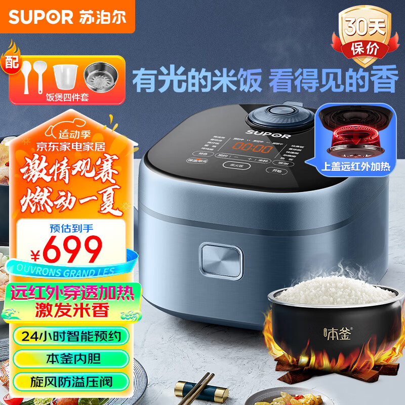 苏泊尔(SUPOR)电饭煲4L电饭锅3-8人家用本釜内胆远红外穿透加热技术大火多功能智能预约定时上盖可拆洗SF40FC686 4L价格:699.00元!