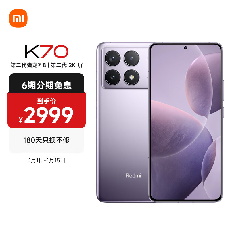 Redmi K70 第二代骁龙? 8 小米澎湃OS 第二代2K屏 120W+5000mAh 16GB+512GB 浅茄紫 小米红米K70 价格:2999.00元!