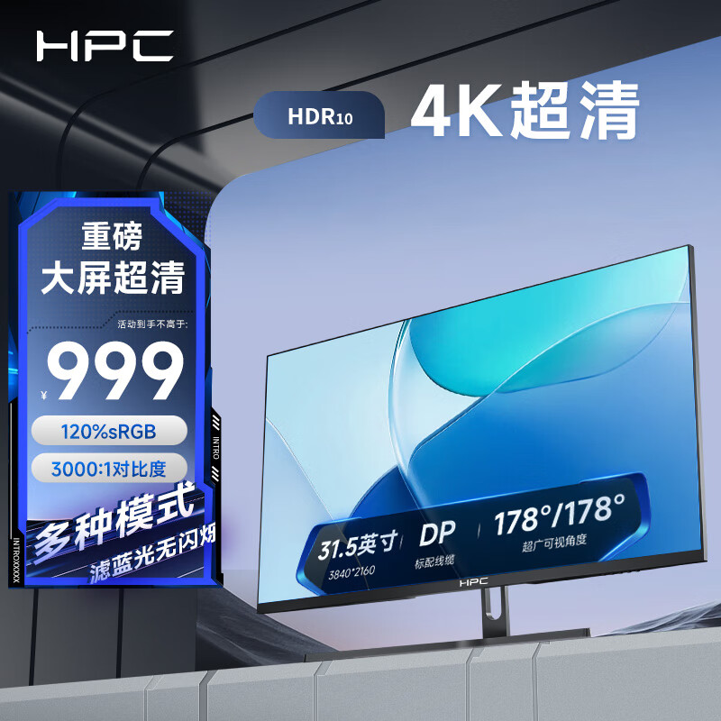 HPC 31.5英寸 4K高清 HDR 120%sRGB广色域 可壁挂 办公影娱电脑显示器H32U价格:1099.00元!