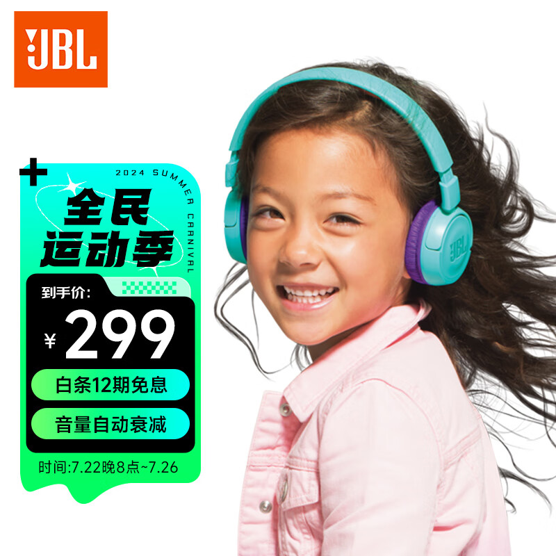 JBL JR300BT 头戴式无线蓝牙儿童益智耳机 低分贝降噪带麦克风英语网课在线教育学习听音乐耳机 绿色价格:339.00元!
