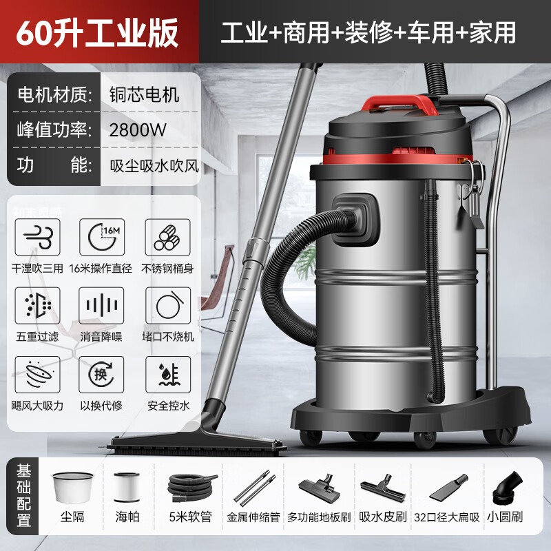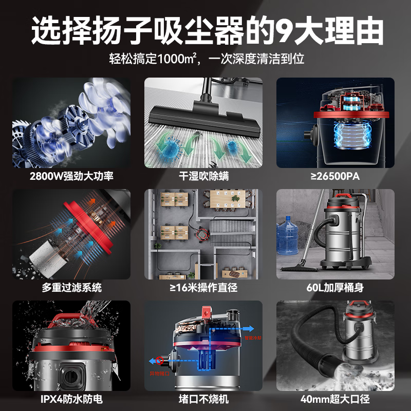 扬子(YANGZI)吸尘器工业商用洗车用酒店装修大功率工厂车间吸尘机峰值2800W大吸力 60L商用大容量价格:659.00元!