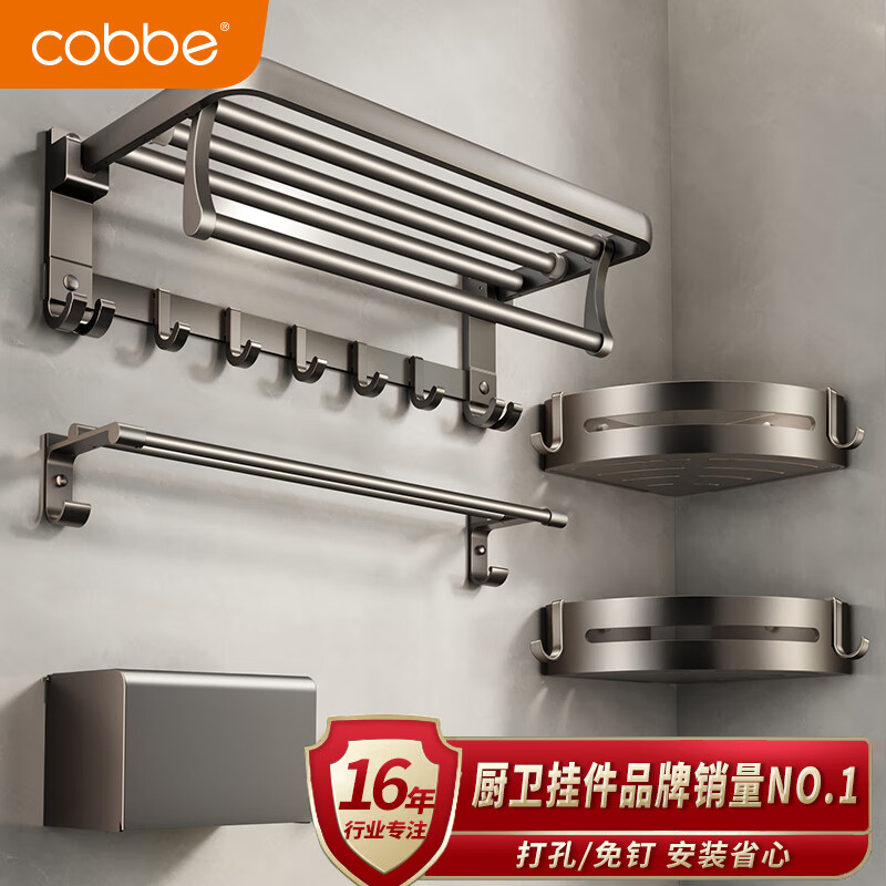 卡贝(cobbe)毛巾架枪灰色卫生间置物架浴室免打孔厕所太空铝浴巾架挂件套装价格:228.00元!