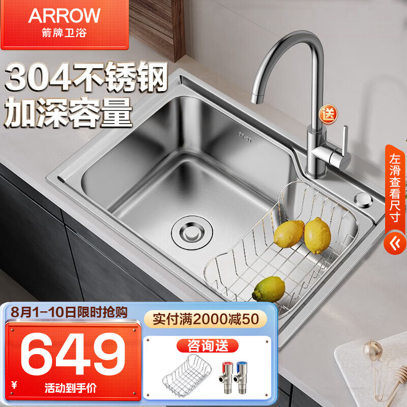 箭牌(ARROW)304不锈钢厨房水槽龙头套装小户型洗菜盆单槽支持台上台下槽安装 C1款 68*44cm+冷热龙头价格:749.00元!