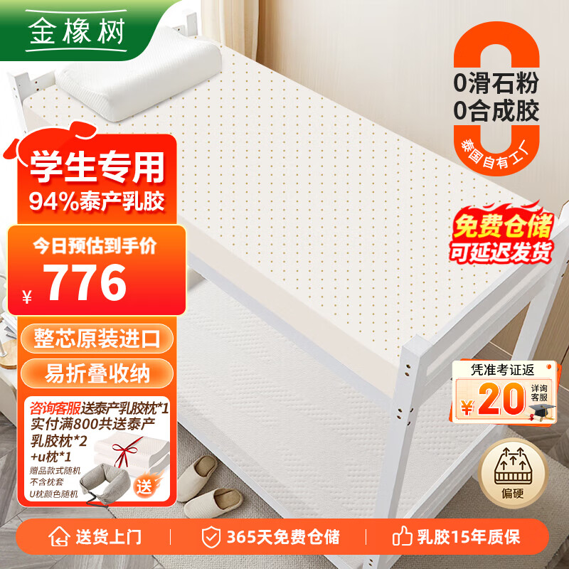 金橡树泰国原产整芯进口天然乳胶床垫宿舍学生单人床垫 90*200*5cm价格:836.00元!
