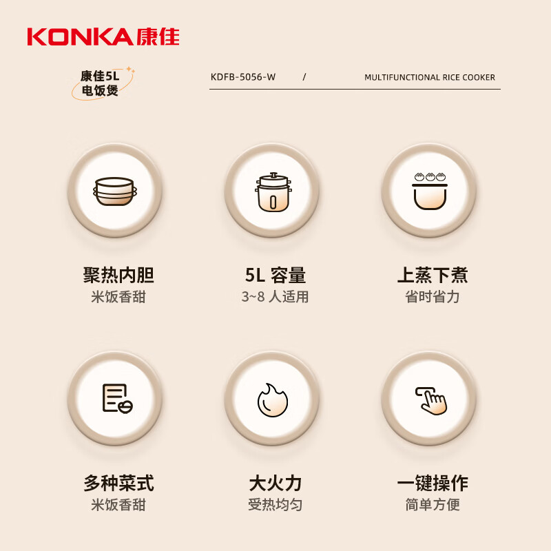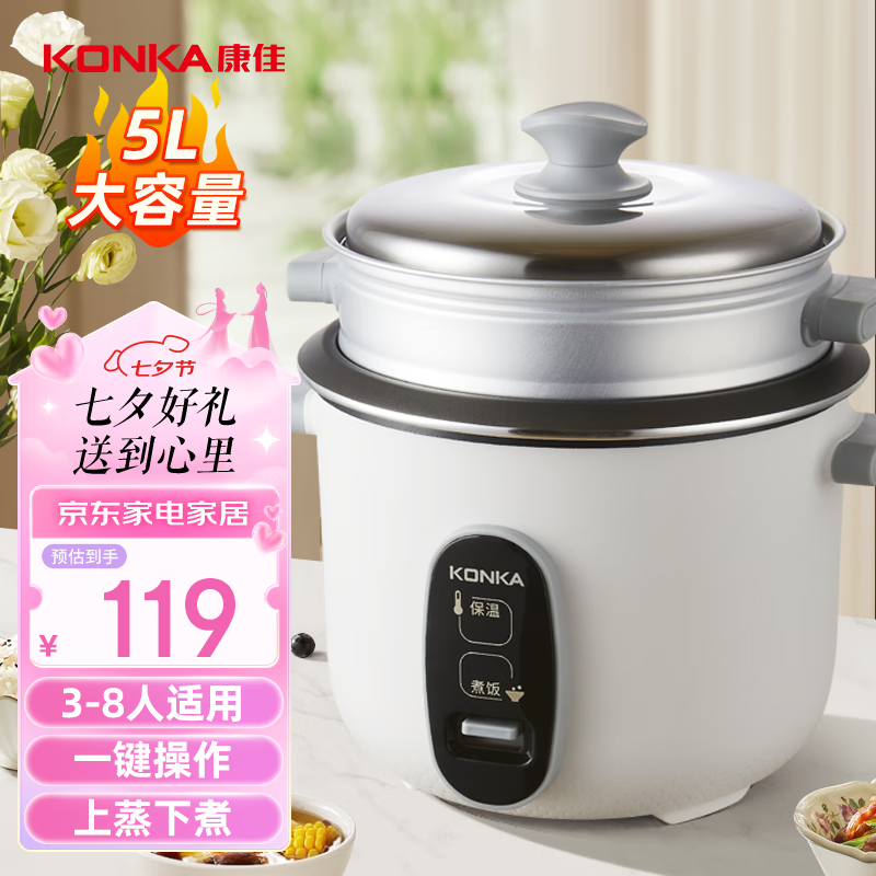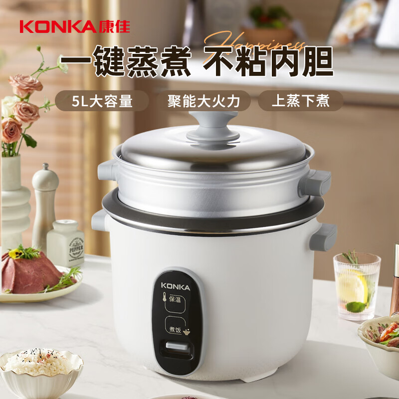 康佳(KONKA)电饭煲电饭锅3-10人家用传统老式直身锅蒸煮米饭煲锅带蒸笼 不粘内胆5L KDFB-5056-W价格:119.00元!
