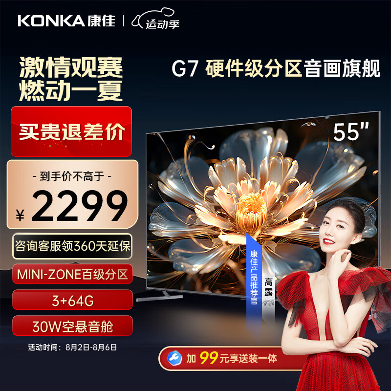 康佳电视 55G7 55英寸 百级分区背光 120Hz MEMC 3+64GB 4K超清屏智能液晶平板游戏电视机以旧换新价格:2299.00元!