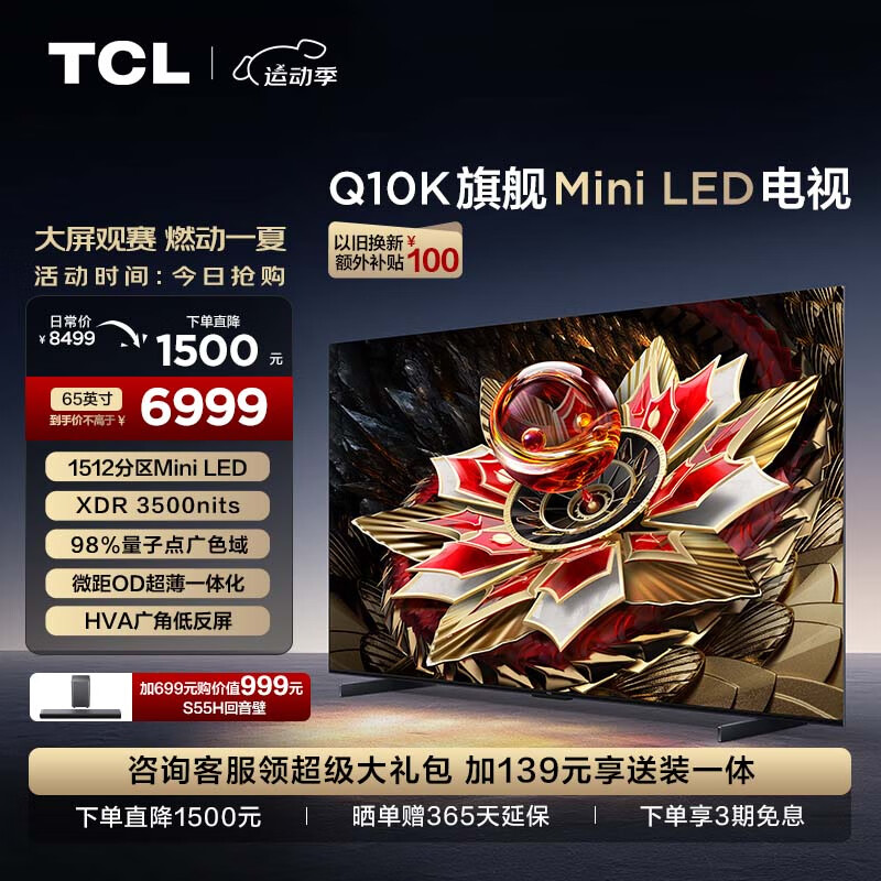 TCL电视 65Q10K 65英寸 Mini LED 1512分区 XDR 3500nits QLED量子点 超薄 4K大屏液晶智能平板电视机价格:6999.00元!