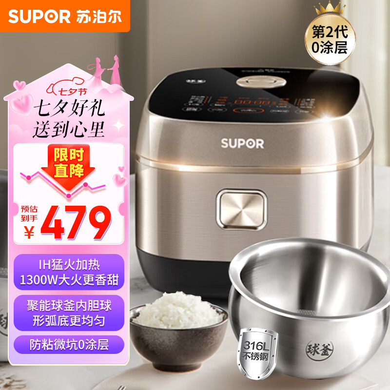 苏泊尔(SUPOR)0涂层电饭煲无涂层IH电磁加热 4L大容量316L不锈钢球釜快煮家用多功能智能3-8人电饭锅SF40HC2984价格:479.00元!
