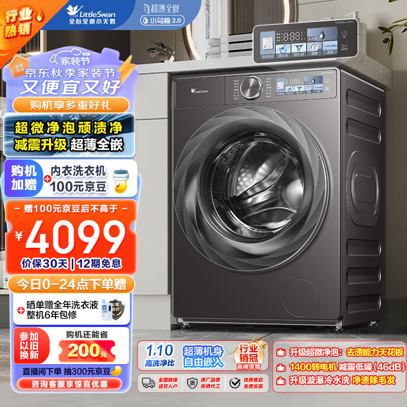 小天鹅(LittleSwan)滚筒洗衣机全自动家用【小乌梅2.0 TG100RVICPRO】超薄全嵌 净顽渍 内衣洗 10公斤大容量 以旧换新价格:4199.00元!
