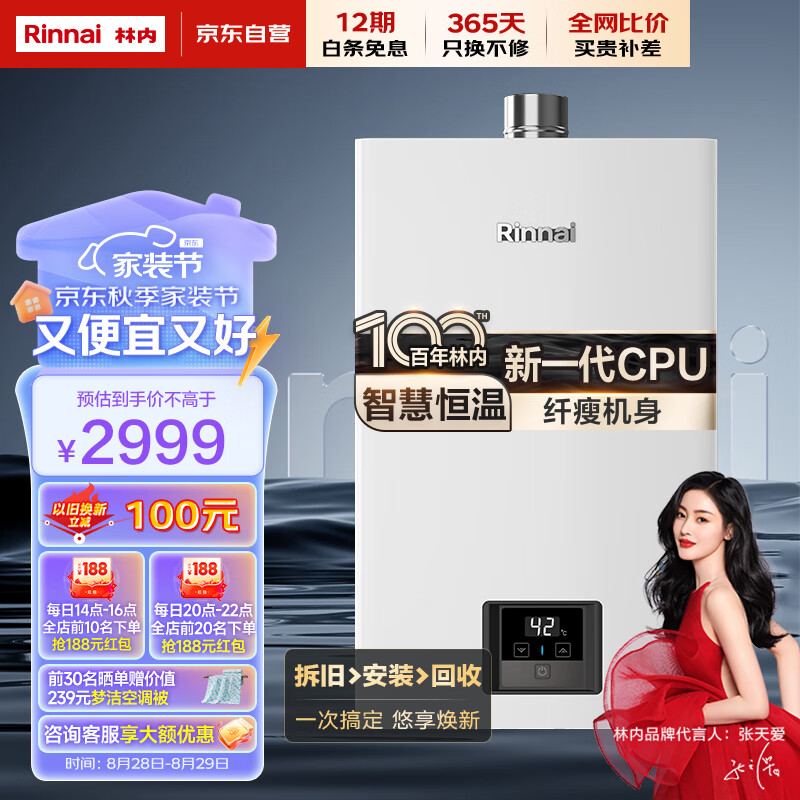 林内(Rinnai)【小蛮腰】16升燃气热水器 智慧恒温 全新升级CPU 黄金窄比 RUS-16GD31(JSQ31-GD31)以旧换新价格:2999.00元!