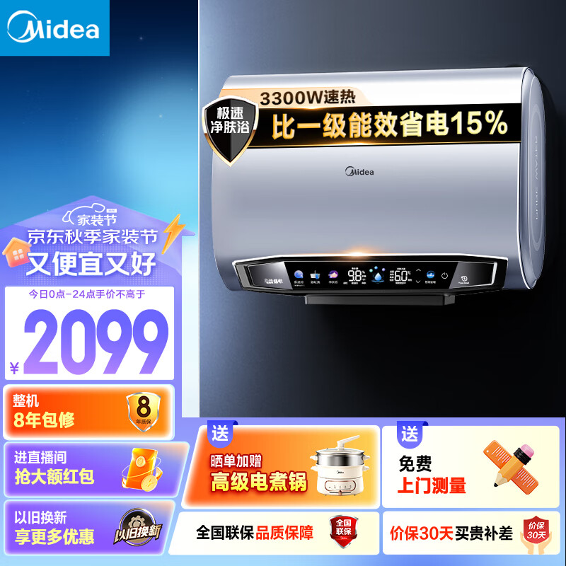 美的(Midea)60升玲珑超薄双胆扁桶电热水器3300W变频 镁棒免换12倍增容一级能效F6032-UD京东小家以旧换新价格:2299.00元!