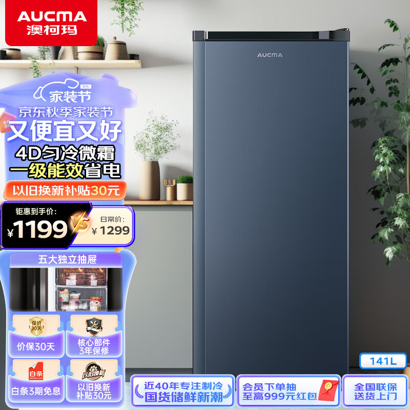 澳柯玛(AUCMA)141升立式冰柜家用冷冻抽提式冷柜 母婴母乳小冰柜冰吧 一级能效以旧换新BD-141NE价格:1199.00元!