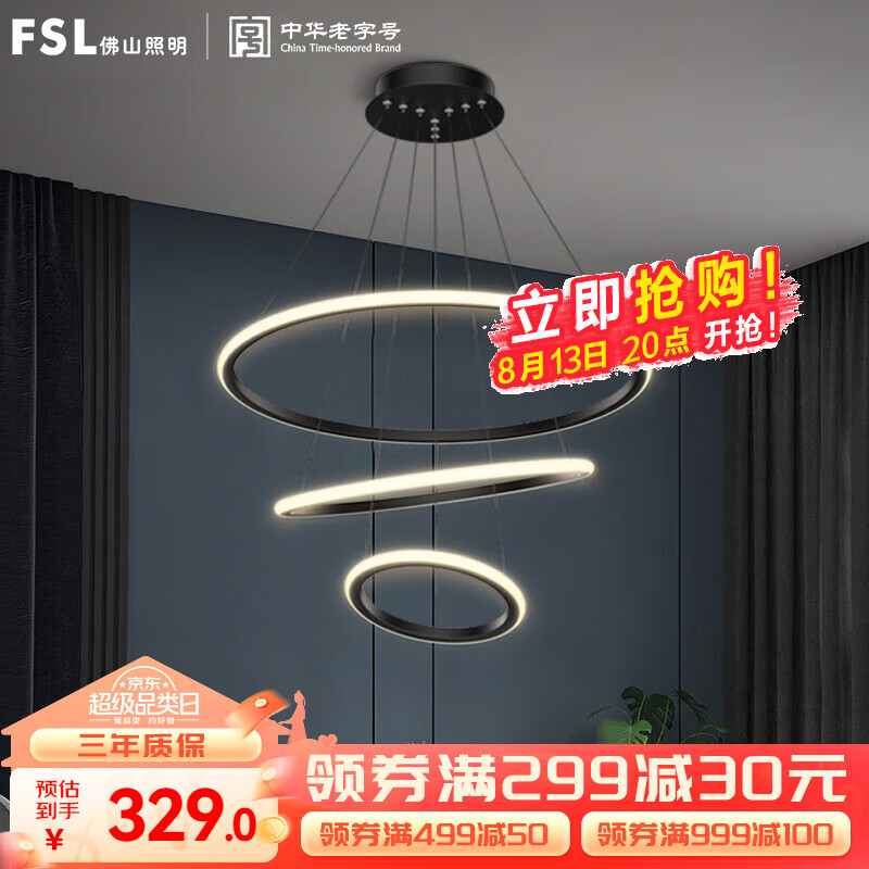 FSL佛山照明餐吊灯LED客厅灯北欧后现代铁艺灯具单色暖白光50422/45W价格:359.00元!