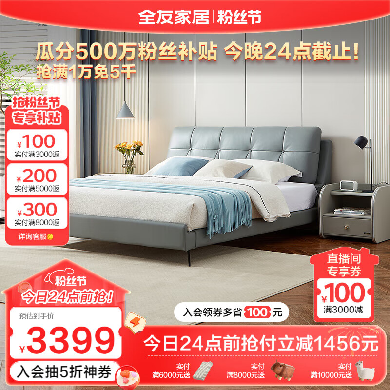 全友家居 真皮艺双人床1.8x2米现代简约主卧室头层牛皮软包大床105135价格:4855.71元!