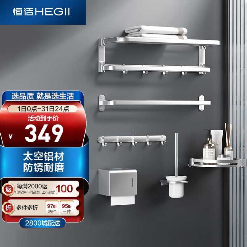 恒洁(HEGII)毛巾架免打孔 卫生间置物架浴室挂件套装太空铝六件套915K06价格:349.00元!