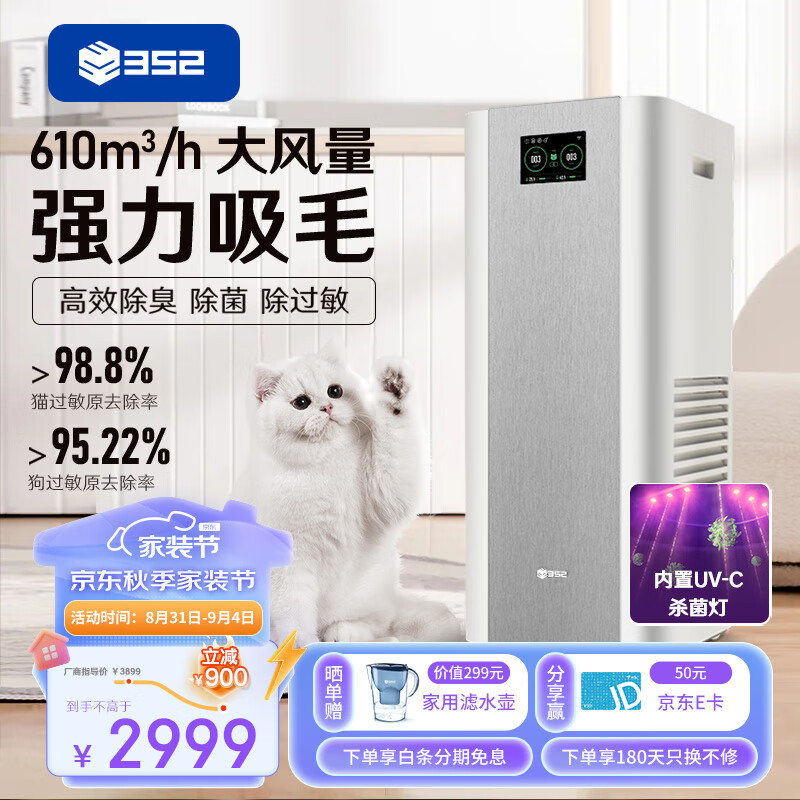 352空气净化器 宠物款猫毛净化器除菌吸毛除异味过敏原除尘螨甲醛 家用吸浮毛 X63 Pet 多宠适用价格:3199.00元!