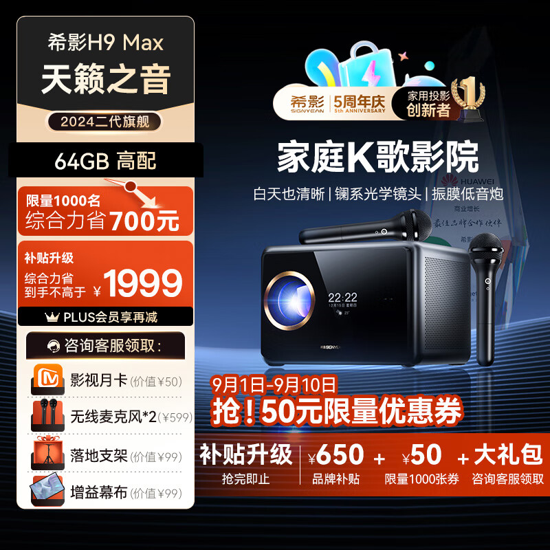希影H9 Max二代 4k家庭K歌影院 家用投影仪 4K高清智能投影 卧室客厅投影机家庭影院 专属KTV 64GB价格:2699.00元!