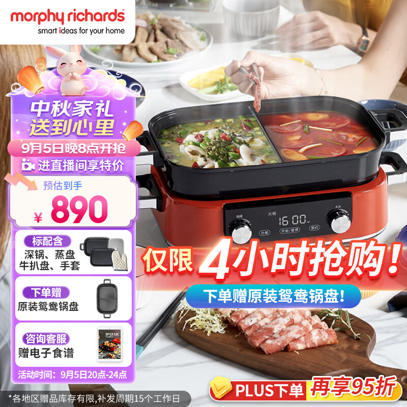 摩飞电器(Morphyrichards)多功能锅 家用电火锅电蒸锅 5升可预约 大功率分体式蒸煮一体不沾煎烤料理锅 MR9099 英石红价格:910.00元!