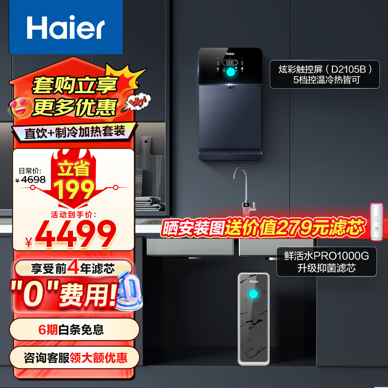 海尔(Haier)直饮加热净水器1000G鲜活水pro家用净水机5年RO反渗透净水机+管线机套装HKC2400-R791D2U1+D2105价格:4499.00元!