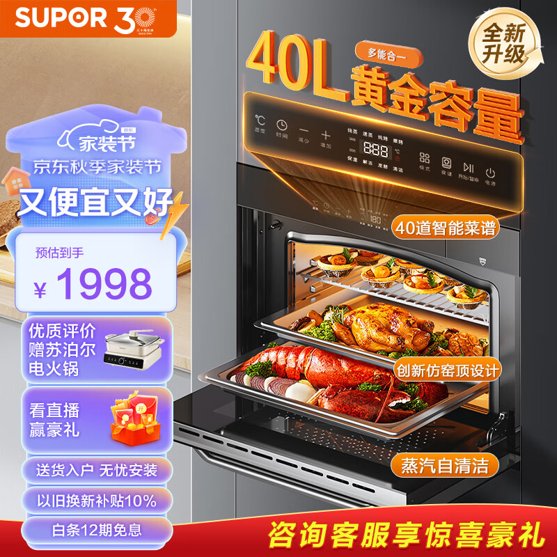 苏泊尔(SUPOR)嵌入式蒸烤箱一体机 家用烤箱 电蒸箱多功能大容量40L ZKQD40-610S价格:1998.00元!