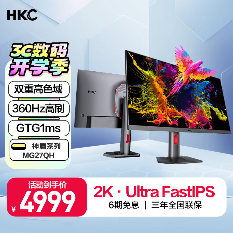 HKC 27英寸 2K 360Hz Ultra Fast IPS 1ms响应HDR600广色域10bit屏幕 旋转升降游戏电竞显示器 MG27QH价格:5999.00元!