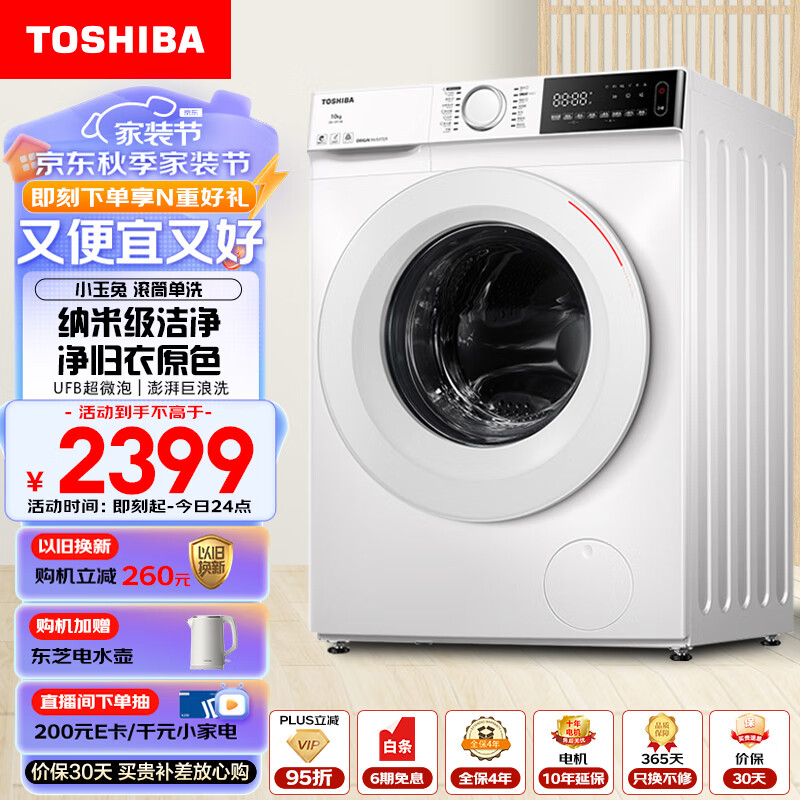 东芝(TOSHIBA)滚筒洗衣机全自动家用【小玉兔DG-10T13B】BLDC变频电机 10公斤大容量 UFB超微泡 以旧换新价格:2199.00元!