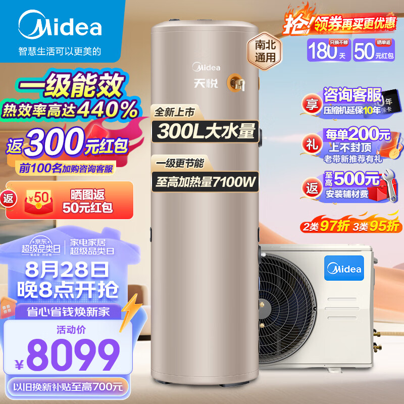 美的(Midea)空气能热水器家用300升超一级能效75℃高温R32冷媒带电辅天悦RSJF-51/DN8-300C(E1)价格:8599.00元!
