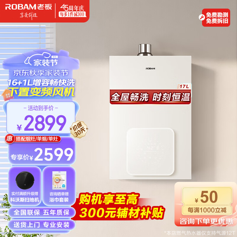 老板(Robam)16+1升盐系G1燃气热水器天然气 澎湃大水量 下置变频风机 智能恒温抗风防冻强鼓式JSQ31-HD660A-16价格:2899.00元!