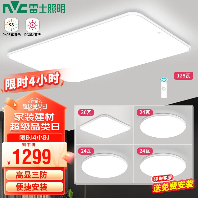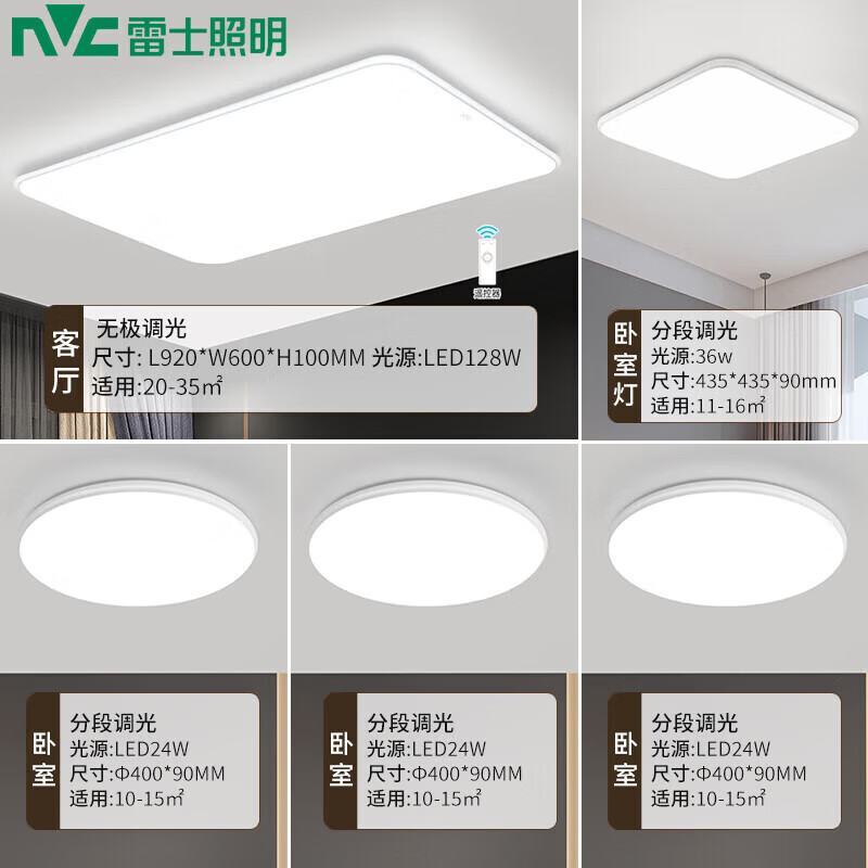 雷士照明(NVC)LED吸顶灯现代简约客厅餐厅Ra95防蓝光小白灯白雪套餐三室二厅价格:2099.00元!