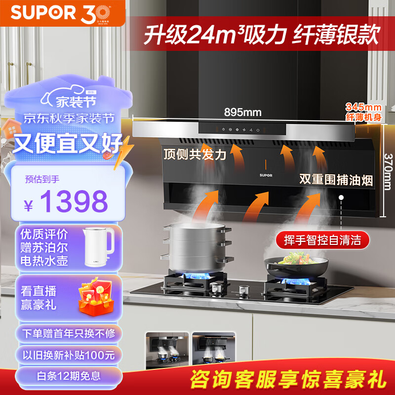 苏泊尔(SUPOR)(SUPOR) 抽油烟机顶侧双吸油烟机7字型 24立方挥手感应免拆洗家用厨房吸油烟机DL11单烟机价格:1398.00元!